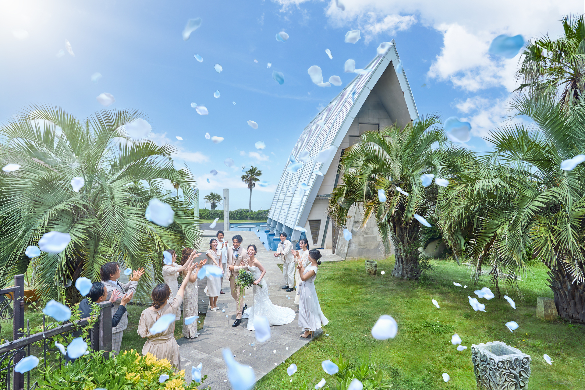 おふたりの永遠の愛を誓う場所として相応しい、水に浮かぶ独立型チャペル。幸せの象徴と言われるロイヤルブルーのバージンロードは海外のリゾートを感じさせ、幻想的な青の世界を作り出します。